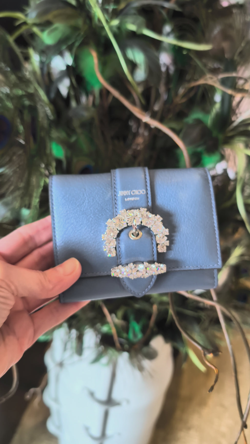 This Jimmy Choo Calfskin Crystal Cheri Compact Wallet is crafted of a Parrot Blue calfskin leather and features a crystal embellishment on the frontal flap. This opens to a matching leather interior with card slots and bill fold.