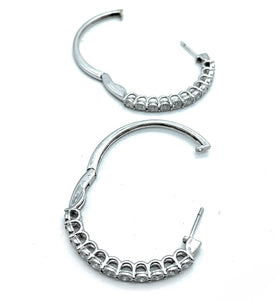 10K white gold hoop hinged earrings with 22 round brilliant cut illusion set diamonds weighing approximately 1.00ctw. they are 34mm in diameter and 3.5mm wide.