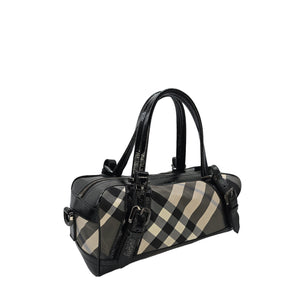 Indulge in luxury travel with our Burberry Beat Check Weekend Bag. Made in Italy, this exquisite bag boasts the iconic Beat Check pattern on its canvas exterior with sleek black patent leather and gunmetal hardware accents. Protective studs at the base, and the dual patent handles ensure durability, while the spacious interior with multiple pockets make for easy organization. Bon voyage!
