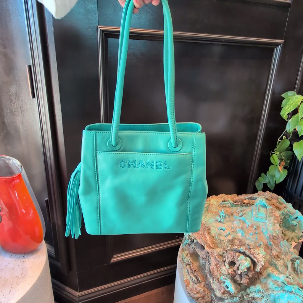 This stunning collector's piece (Circa 1997-1999) is crafted from luxuriously soft Lambskin leather in a vibrant turquoise hue. It features the iconic tone-on-tone embroidered "CHANEL" logo on the front and a signature oversized leather tassel on the zipper. A rare opportunity to own a piece of Chanel history that offers timeless style with a brilliant pop of color.