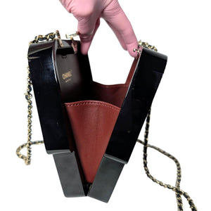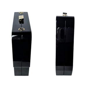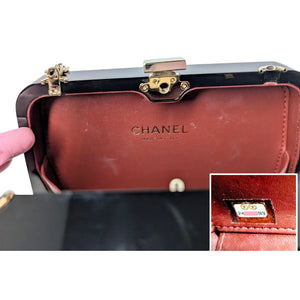 Designer: Chanel Material: Resin Color: Black Style code: A94648 Serial Code: 24XXXX93 Collection: Pre-Fall 2017 Measurements: 6.4" x 7.4" x 1.7" (wxhxd) Strap Drop: 21.5" Interior Lining: Tonal leather Opening/Closure: Kiss-Lock Hardware: Gold-tone / Imitation Pearls / Crystals Accompanied By: Entrupy Certificate Overall Condition: Excellent Pre-Loved condition; missing four crystals in the back, minor markings at interior (see photos for details).