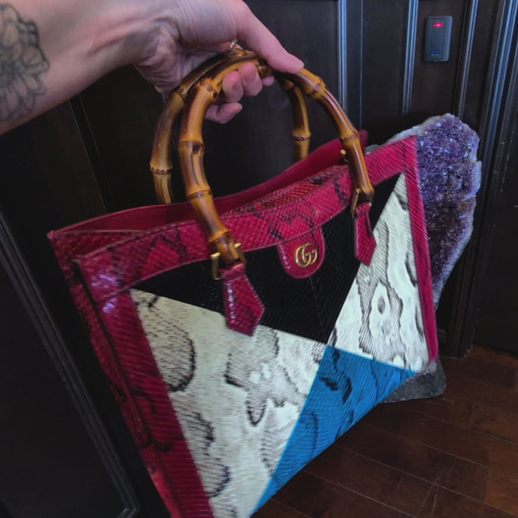 Experience luxury and sophistication with this Italian-crafted Gucci Python Diana Bamboo Tote. Its multi-colored Snakeskin material is complemented by Bamboo top handles and gold-tone hardware. This tote features a magnetic closure, spacious leather-lined interior, and multiple pockets. Comes with an Entrupy Certificate for peace of mind.