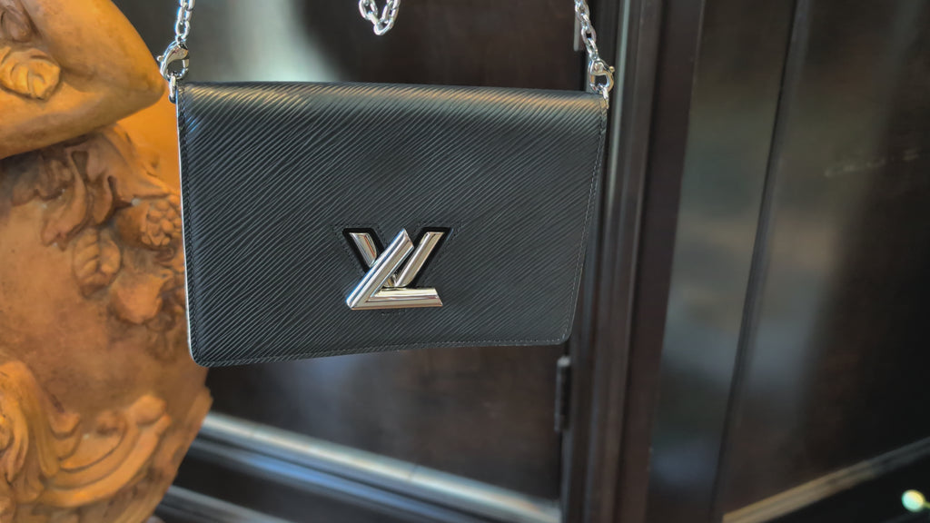 Transition effortlessly from day to evening with the Louis Vuitton Black Epi Twist Belt Chain Wallet. Made in France in 2019, this piece boasts iconic Epi leather, an LV twist lock, and a 20.5" chain strap, complete with a luxurious Alcantara interior for organized essentials.