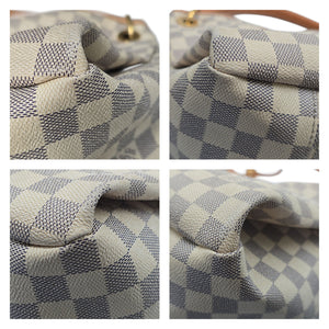 Designer: Louis Vuitton Material: Damier Azur Canvas Trim: Natural Cowhide-leather Trim Date/Authenticity Code: TX4118 Year Manufactured: 41st week of 2018 in the United States Measurements: 18" x 12" x 8" (wxhxd) Handle Drop: 3" Interior Lining: Microfiber Opening/Closure: Open top Interior Pockets: Large zipped and 6 inside flat pockets (3 on each side) Hardware: Golden brass Includes: Bag charm, Entrupy COA