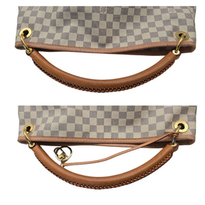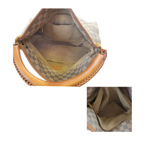 The Louis Vuitton Damier Azur Canvas Artsy Hobo Bag combines elegance and practicality with its supple canvas and natural cowhide leather trim. Featuring a luxurious laced leather handle and golden brass hardware, this bag offers a chic, feminine appeal. Its spacious interior includes a microfiber lining, a large zipped pocket, and six flat pockets for organized storage. Measuring 18" x 12" x 8" with a 3" handle drop, it opens at the top for easy access.