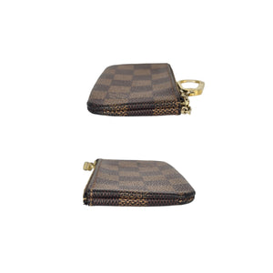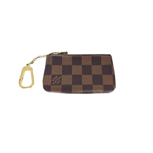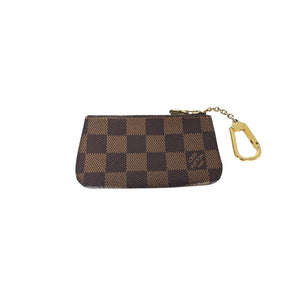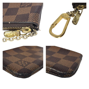 The Louis Vuitton Damier Ebene Key Pouch is a true symbol of luxury. Its classic design, featuring the iconic Damier Ebene canvas and leather trimming, is complemented by gold-tone hardware. The secure zipper closure opens up to a spacious interior. This pouch is certified authentic by Entrupy and is in very good condition, making it the perfect accessory for storing your keys and essentials in style. Measurements are 4.5" x 2.5" x 0.25" (wxhxd).