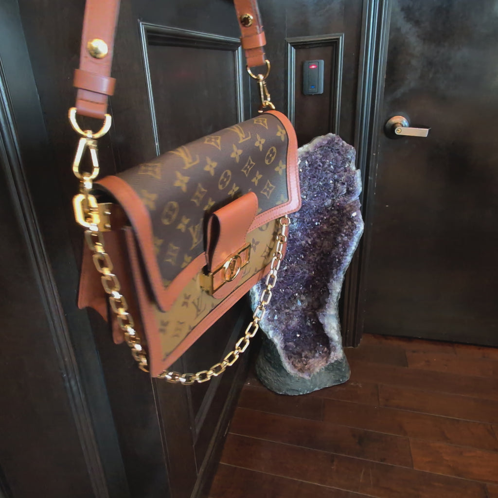 This Louis Vuitton Reverse Monogram Dauphine MM is crafted of Louis Vuitton monogram on toile canvas. The bag features a toffee-colored leather shoulder strap, a gold chain strap, and a facing flap with a toffee leather trim and a decorative brass Louis Vuitton logo clasp. This opens to a partitioned black microfiber interior with zipper and patch pockets.
