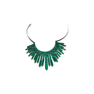 We are offering this SUPERB choker necklace. Handcrafted by Navajo artistFederico Jimenez James from heavy gauge Sterling Silver, it is adorned with 27 rows of hinged bezel sections hanging from the choker. Each row has 3 sections of handcut Nevada Broken Arrow Variscite totaling 81 stones. The rows have been meticulously placed to graciously flow along the neckline. Measuring 17" long (closed) it weighs grams. It is hinged and a pushbutton box closure.