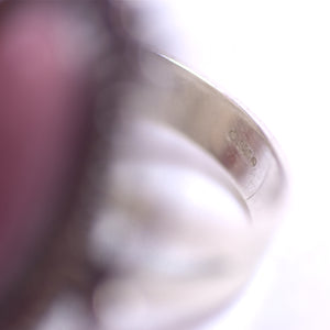 A Southwestern style sterling silver ring with a pink oval rhodochrosite Cabochon ring. The silver features a ray design radiating out of the rhodochrosite stone.