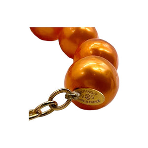 We are offering this vintage Chanel synthetic pearl necklace. This rare Chanel piece is finely crafted of 18 jumbo orange-colored faux pearls with a gold-tone chain & hook closure. This necklace is perfect to add to your vintage jewelry collection!