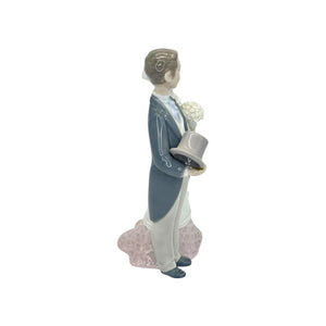 Celebrate timeless romance with this exquisite Lladro porcelain figurine, "Boda de Antaño" ("Wedding of Yesteryear"), Ref. No. 4808. Handcrafted in Spain by Lladro’s master artisan Juliuo Fernandez in 1972, this piece embodies the brand’s renowned attention to detail, elegance, and exceptional quality. The figurine features a graceful bride in a delicately sculpted gown, holding a bouquet of flowers, standing beside her distinguished groom, dressed in a classic formal suit and holding a top hat. Their serene expressions and the soft, muted color palette lend a sense of quiet intimacy and refined charm—making it a cherished addition to any collection or an ideal romantic gift. This Lladro piece was retired in 2005.